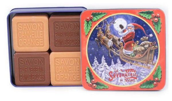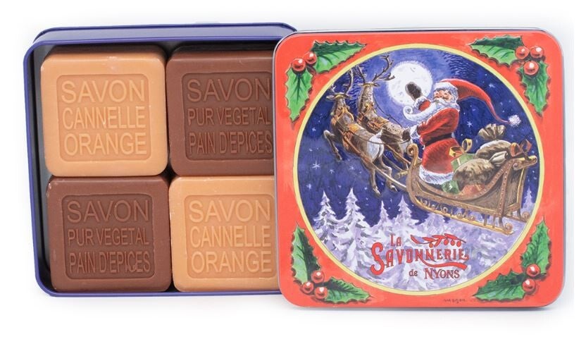 Cette boîte métal au style vintage sur le thème de Noël contient 4 savons de 100g parfumés au pain d’épices et au parfum cannelle/orange. Ces senteurs épicés vous plongeront dans la douce ambiance de Noël… Vivez un instant de bien-être avec ces 4 savon enrichis en beurre de karité BIO et à l’huile d’olive de Nyons. Ces savons sont adaptés à tout type de peau..Idéal pour offrir ces savons raviront vos proches. La jolie boîte livrée avec les savons a été illustrée par Luc MAZAN un artiste peintre Nyonsais. C’est un cadeau idéal pour faire plaisir à vos proches ou vous faire plaisir. Une fois les savons terminés vous pouvez réutiliser la boîte !.Savons artisanaux fabriqués en France dans notre savonnerie située à Nyons en Drôme Provençale – Fragrance en provenance de la ville de Grasse capitale du parfum..Conseils d’utilisation.Appliquez sur peau humide. Faites mousser et rincez à l’eau abondamment. Evitez le contact avec les yeux. En cas de contact rincez abondamment les yeux à l’eau claire..Boite métal « Le Traîneau ».Dim : 145 x 138 x 37.Livré cellophané dans sa boite métal