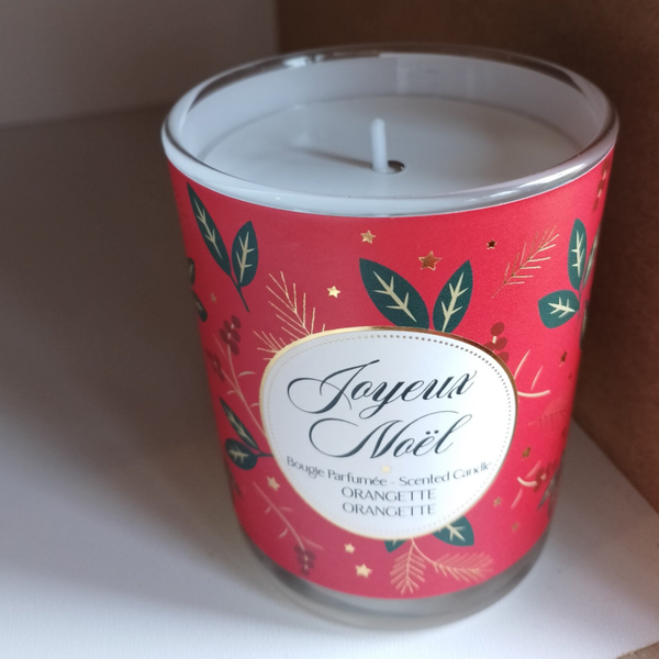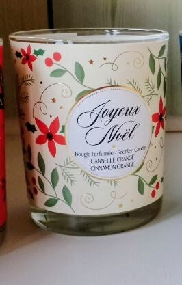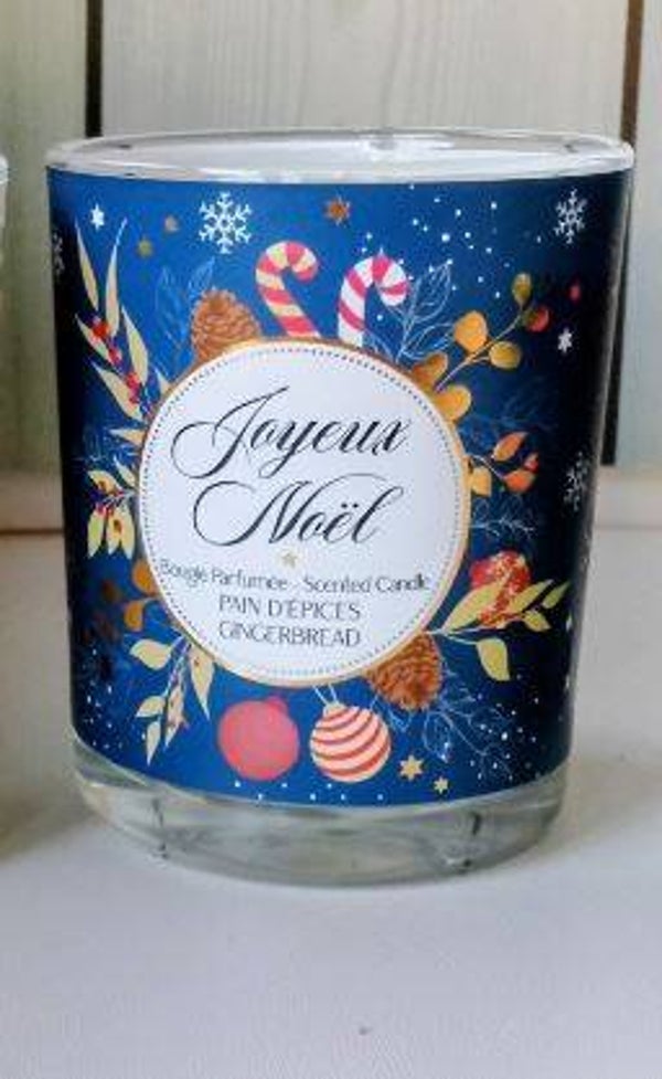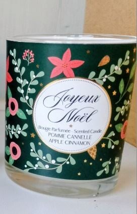 Bougie parfumée "joyeux Noël"à base de cire de soja dans un verre décoré aux motifs de Noël.