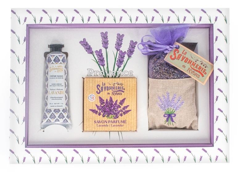 Plongez dans l’ambiance envoûtante de la Provence avec notre tout nouveau coffret souvenir. Ce coffret contient trois produits au délicat parfum de lavande : Une crème pour les mains (30 ml) Un savon rond (50 g) Un sachet de fleurs de lavandin (25 g) Le.cadeau parfait à offrir ou à s’offrir pour prolonger les vacances.